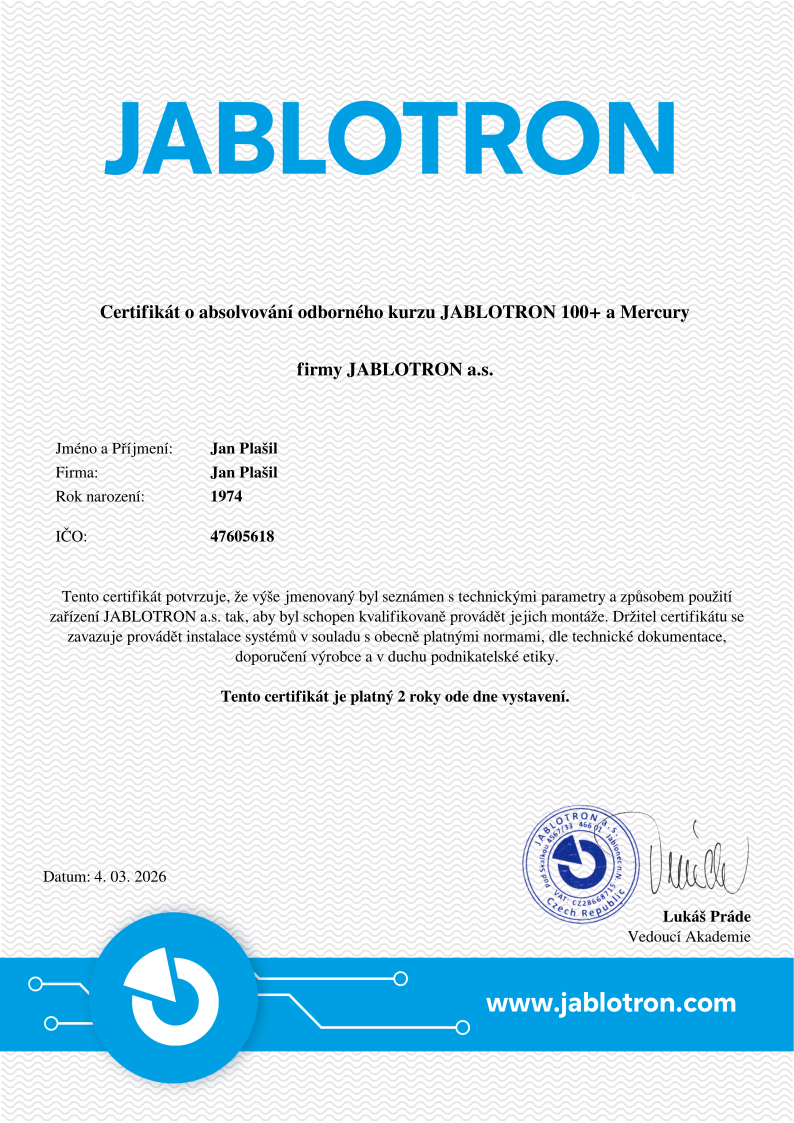 Jsme certifikovaný montážní partner zabezpečovacích systémů JABLOTRON. Nabízíme instalaci alarmů pro byty, rodinné domy i komerční objekty.